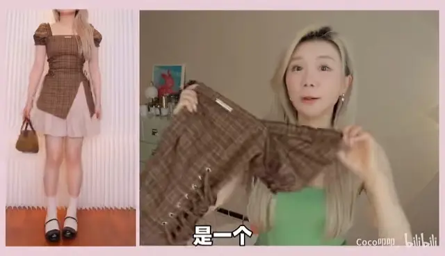 甜酷风,泡泡袖一字领两穿,袖口位置有松紧不用担心掉。胸口服帖度好,可可色格纹的配色,版型偏修身,腰侧有绑带,增加设计感,匹配更多人身材。不规则开叉,波浪下摆很精致。饼干色裙身+奶茶色下摆。凸现胸线腰线,臀部线条过渡流畅。版型配色质感都不错。全身无弹但是不会有束缚感。