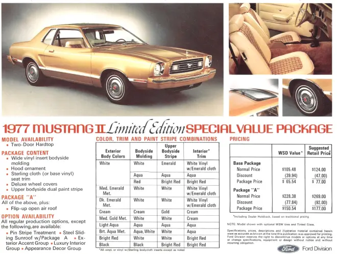 1977年,福特推出了特别限量版Special Value Package套件包,车主可以更加个性化地定制自己的Mustang II