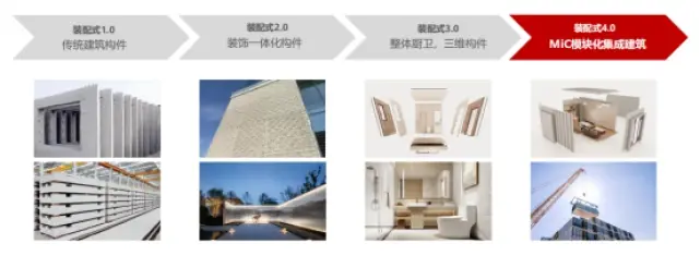 装配式建筑发展到今天经历了四个发展阶段:装配式1.0--传统建筑构件;装配式2.0--装饰一体化构件;装配式3.0--整体厨卫,三维构件;装配式4.0--MiC模块化集成建筑。