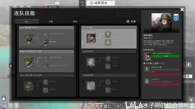 在大战略地图上完成任务获得技能点后可以解锁新能力、新的单位、对兵种或者技能方面的强化升级,让整个战斗也丰富多彩,更加轻松。这个升级主要是针对派出的连队进行升级,不同连队兵种升级的东西不一样。