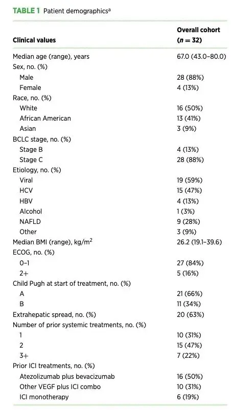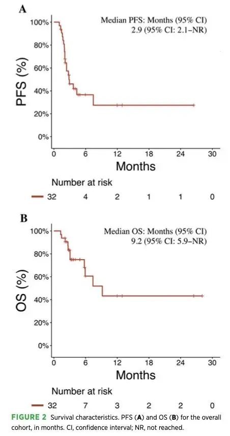 在符合纳入标准的32名患者中,既往的抗PD-(L)1方案包括阿替利珠单抗联合贝伐珠单抗(50%,n=16)、其他抗VEGF药物联合抗PD-(L)1(31%, n = 10),抗PD-(L)1单独治疗(19%, n = 6)。