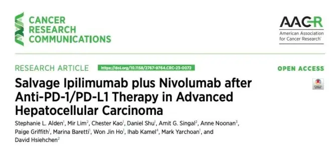 Alden SL, Lim M, Kao C, Shu D, Singal AG, Noonan A, Griffith P, Baretti M, Ho WJ, Kamel I, Yarchoan M, Hsiehchen D. Salvage Ipilimumab plus Nivolumab after Anti-PD-1/PD-L1 Therapy in Advanced Hepatocellular Carcinoma. Cancer Res Commun. 2023 Jul 20;3(7):1312-1317. doi: 10.1158/2767-9764.CRC-23-0072. PMID: 37484200; PMCID: PMC10356567.