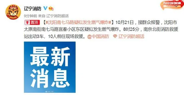 记者从辽宁省消防获悉,10月21日,接群众报警,沈阳市太原南街南七马路宜春小区东区疑似发生燃气爆炸。8时25分,南京北街消防救援站出动3车、10人前往现场救援。