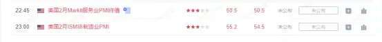 今天的依然是经济数据啊,首先就是一个服务业的一个数据,服务业的前值跟这次预期的数值是一样的,没有衰退也没有增长,还有一个美国2月ISM非制造业的PMI的数据,表示预测的是低于前值的,整体数据是利空与黄金的,后边就看实际数据的公布了,我预计本次数据将会利空与黄金。