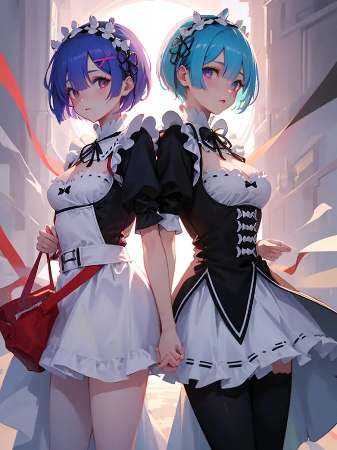 2girls,Zomso-bin style, character concept art, rem re:zero, blue bob hair, maid outfit, harsh lighting, --ar 2:3.bie