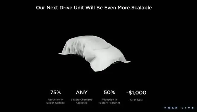 特斯拉的第三代平台将用来推出各种定位的电动车,此平台主要特色在于将使用全新的驱动单元,会把碳化硅的使用量大减 75%,同时还可支持使用任何化学成分的电池,更重要的是驱动单元的整体成本将控制在 1000 美元。