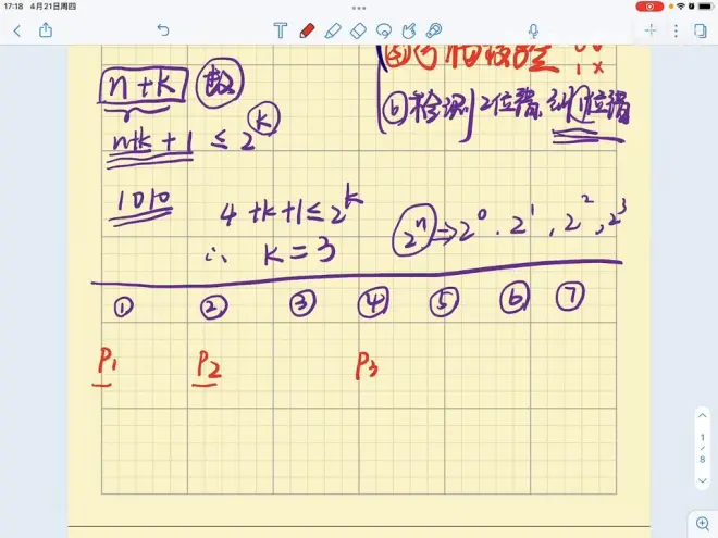 不等式计算:n+k+1≤2^k,表示有(n+k)个只错1位的错误情况,和1个正确的情况,这些需要小于等于校验码能够显示的数量,即2^k。通过计算4+k+1≤2^k得k=3