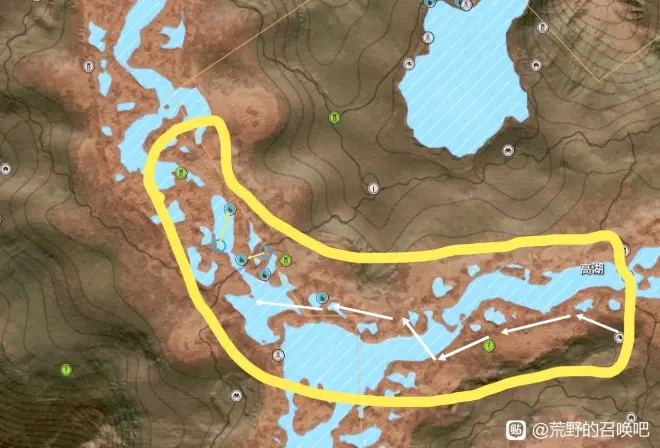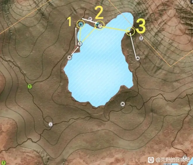 去自己的湖摸好点,自己找个能观察到的位置,让你写你也能。 湖泊分布区2 视野情况:良好 种群数量:多 推荐指数:高 出帐篷上三脚架,优先观察1、2、4点位。随即去捡尸体同时观察3点位即可。
