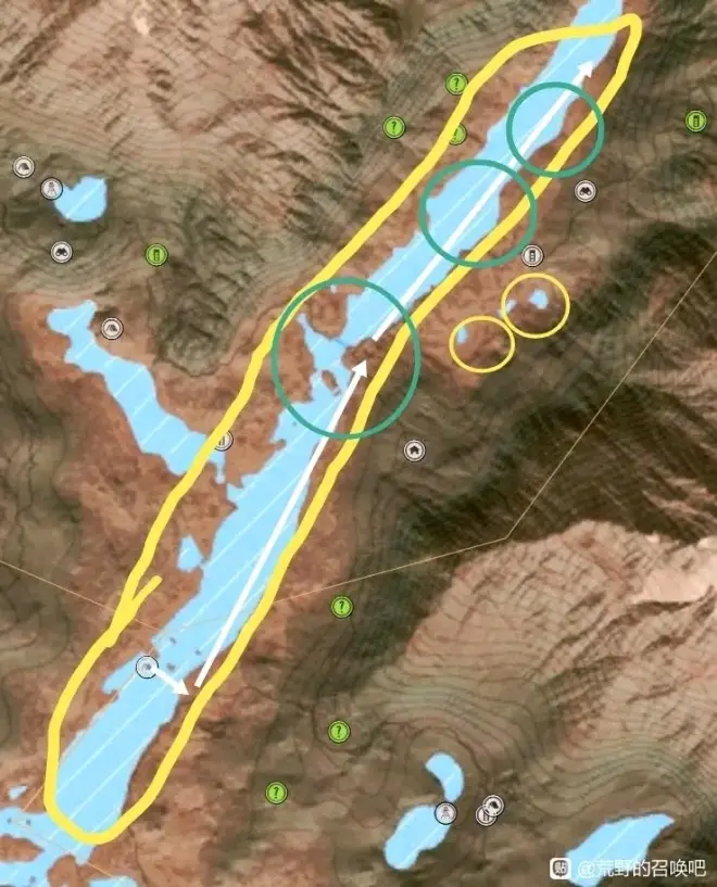 湖泊分布区1 视野情况:优秀 种群数量:多 推荐指数:高 粉字代表帐篷传送次序,白圈以帐篷1为主体。观察5、6号点位。 先向南看8号点位,此时3号点位也放出来了,慢慢摸到三点位小水洼对岸。 传2帐篷,先观察1号点位,随后往前观察7号点位。 往南寻找角度,观察被压住的4、6点位即可。 虽然标注了许多点,但实际点位非常少,排除了纯母点位与没有的。