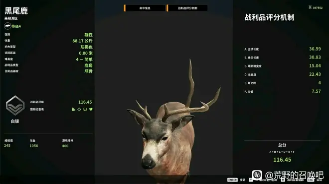 一、物种基本信息 1.物种名称:黑尾鹿 2.总猎取难度:中等偏高 3.良品(钻石)率:中 良品(异色)率:低 4.战利品分数 白银:76.92 黄金:134.44 钻石:177.58 最大体重区间:81-95kg(注:黑尾仅雄性出钻) 5.弹药等级和推荐枪械 弹药等级:4 推荐枪械:.303,.308等4-8级弹药或新7MM等4-9级弹药 6. 警惕性:中等(视力好,嗅觉较敏锐) 7. 出钻(最高)等级:5-中等(5级有一定的伪钻几率,等级为4-简单时也有极低的概率出钻) 8. 黑尾有三种稀有色,分别是黑化,白化,花斑。