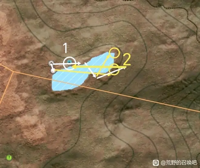 湖泊分布区7 视野情况:优 种群数量:多 推荐指数:高 先上三脚架打1号点位,捡尸体同时观察放出来的2号点位即可