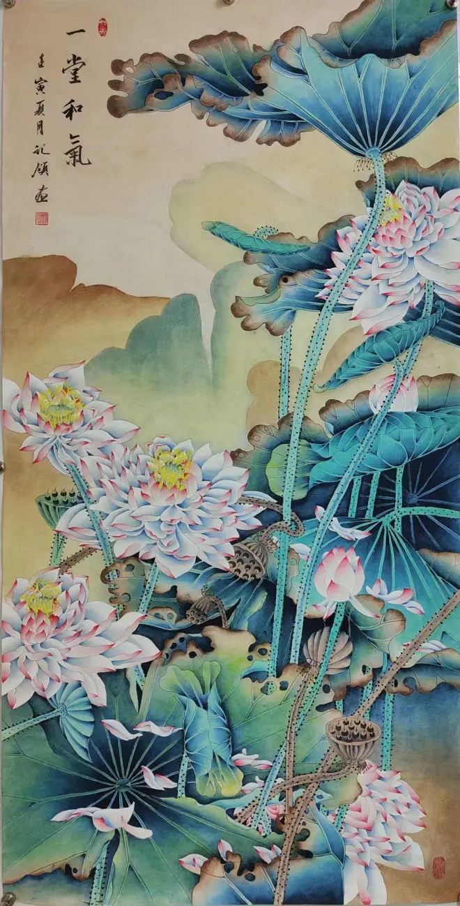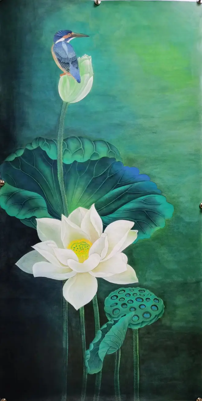 胡记领的工笔花鸟,工致,明艳,雅致,作品多取材以牡丹、荷花、锦鲤、这种人们喜闻乐见的题材,外取物之骨相形态,内表人格心灵,以形写神,以神造形,追求形神统一,他为一花一草注入鲜活的时代气息,作品散发着画家的细腻情感。
