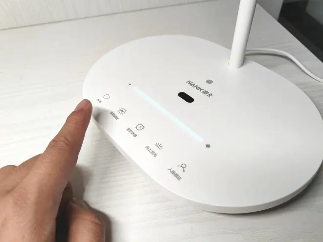台灯整体以白色为主, 这款南卡L1 Pro护眼台灯的外观采用了简约设计风格,整体设计比较圆润,没有过多的元素修饰,在灯的底座上分别有开关、智能调光、定时休息、向上发光、入座感应5个按键以及一块亮度调试条。配件方面有一本说明书、电源适配器。