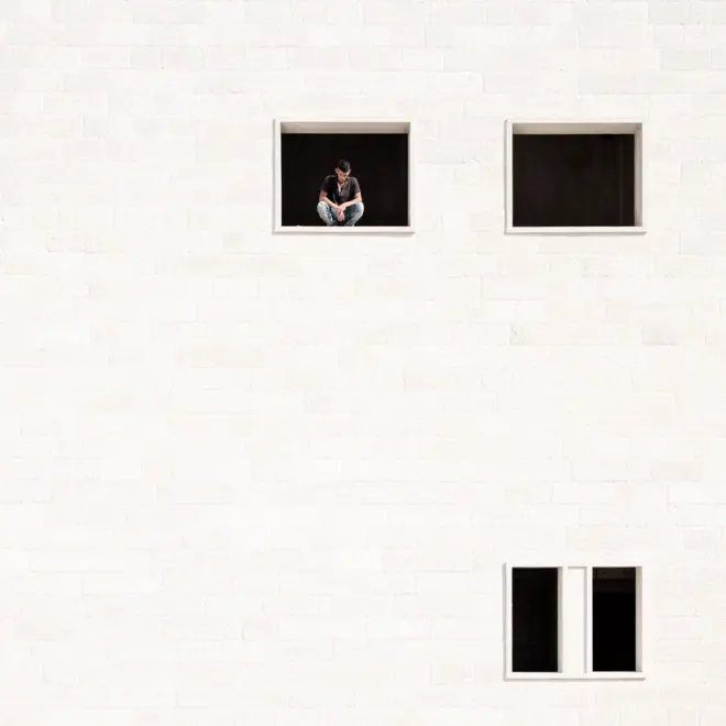 一个人蹲在画面上方的窗口,身影孤独的往下看。