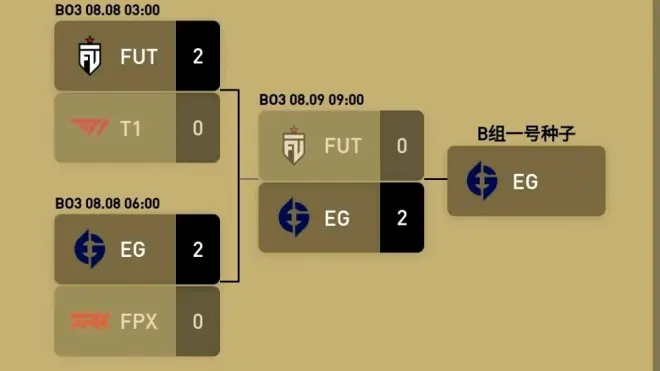 目前小组赛胜者组决赛已经打完了,四个组都有一支战队,已经晋级了八强,其中A组来自印度尼西亚的PRX战队,先以2:0击败阿根廷的KRU,后续又2:0零封中国EDG,成功从小组赛出线;而B组的北美EG战队,首轮2:1击败韩国T1,胜者组决赛中,又2:0零封欧洲FUY,收获了八强名额。