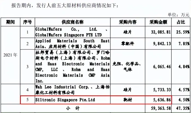 招股书(注册稿)披露,2021年整个年度的前五大供应商名单中,Siltronic Singapore Pte.Ltd位列第五,成为晶合集成的靶材供应商,双方这一年的交易金额为5,636.86万元。