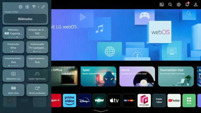 不仅是新的起始页,而且可以快速选择不同的菜单。如果只短按遥控器的齿轮键,LG G3屏幕左侧就会出现许多小菜单卡。它们可以快速检查图片模式等内容,并在必要时进行更改。这安排得很清楚,在日常生活中的常规设置下提供了很大的帮助。