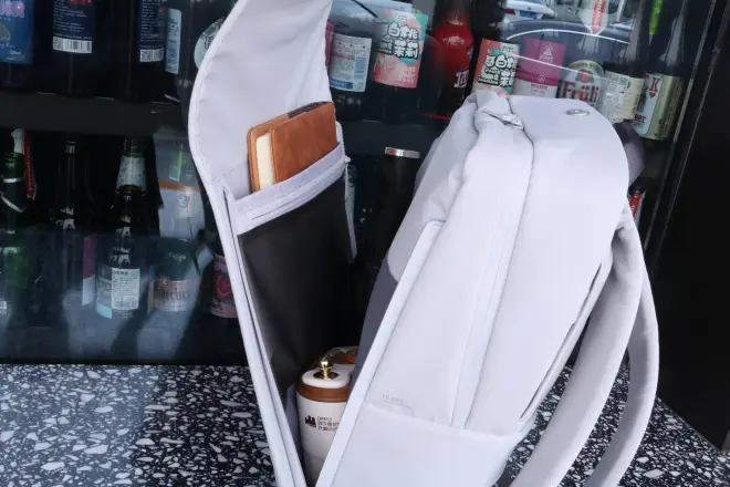 我所说的都是在出行路上自己单手就可以操作的。当然这样的位置设计也可以放一些充电器、公交卡。此外它的两侧还设计了隐藏式拉链来控制它的容量,当然完全当做一个完整的背包区也是可以的。