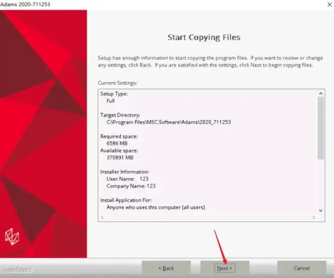 25.点击【Browse.】更改软件安装路径,建议安装在除C盘之外的其它磁盘内,可在D盘或其它磁盘内新建一个【Adams2020】文件夹,然后点击【Next】