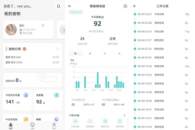 手机下载安装petgugu应用,添加宠咕咕自动喂食器并进行配网,成功后就可以远程通过APP进行一系列操控啦。支持OTA升级,可以不断优化喂食器功能,提升体验。在APP上,我们可以实时查看宠物的进食量,并且通过柱状图的方式展示日周月年的数据,清晰明了。喂食器什么时间出粮,宠物什么时间进食,它都有记录下来。