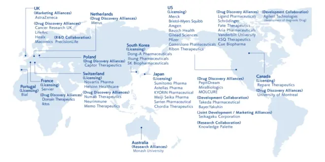 除了通过内部研究扩大其产品线外,小野制药还积极开展许可活动,旨在进行药物发现合作,以开发创新产品,并为包括日本在内的全球制药或生物风险投资公司正在开发的新候选药物进行许可。小野制药的许可工作侧重于从商业角度来看被认为是战略性和有效的化合物,以及从具有高医疗需求的疾病的角度来看被认为是可行的化合物。以下是小野制药在全球范围内的部分合作伙伴分布图。