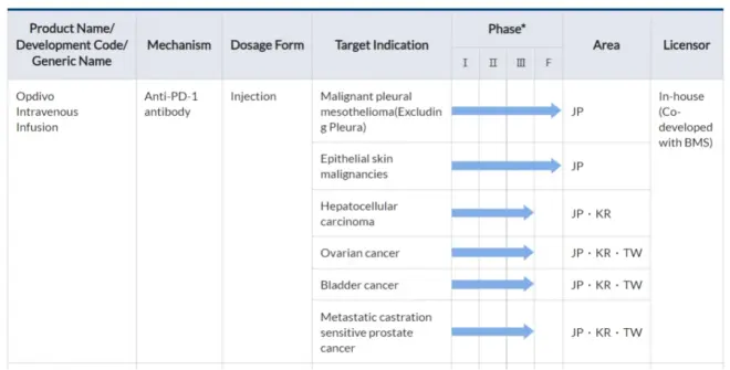 在日本,小野制药于2014年9月推出了Opdivo,用于治疗不可切除的黑色素瘤;此后,Opdivo于2015年12月获得不可切除的晚期或复发性非小细胞肺癌的其他适应症的批准;2016年8月获得不可切除或转移性肾细胞癌的批准;2016年12月获得复发或难治性经典霍奇金淋巴瘤的批准;2017年3月获得复发性或转移性头颈癌批准;2017年9月用于治疗化疗后进展的不可切除的晚期或复发性胃癌;2018年8月获得用于治疗化疗后进展的不可切除晚期或复发性恶性胸膜间皮瘤、化疗后进展的微卫星高度不稳定表型(MSI-High)不可切除的晚期或复发性结直肠癌;2020年2月获得化疗后进展的不可切除的晚期或复发性食管癌批准;2021年12月获得原发灶不明的癌症的批准和2022年3月尿路上皮癌的辅助治疗。