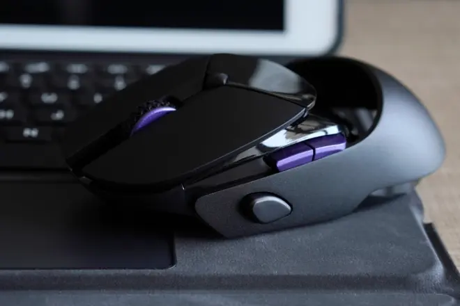 机身左侧设计有前进、后退两枚紫色侧键,比较贴合手指曲线,手感清脆利落,按压轻松方便。