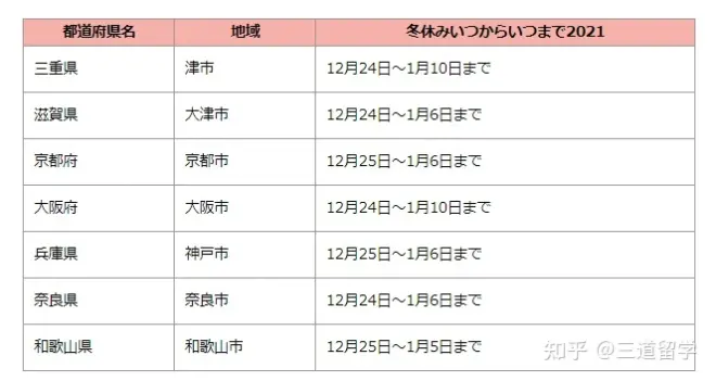 以下是日本小学、初中今年各地区的寒假期间(高中一般也会随着小学、初中来,个别学校会有变动):