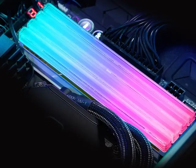 首先,光威神策系列DDR5内存条在外观上,采用陶瓷白色金属烤漆工艺,精湛的工艺让内存条时刻保持高度质感,加上黄白配色,尽显皇家高贵,结合冰晶果冻发光条,闪烁的光芒,带来视觉上的震撼和冲击。同时,双面采用显卡级别的高性能硅脂散热垫,将散热片、PCB和颗粒紧贴,无惧运行时散发的高温,时刻开启强效导热。