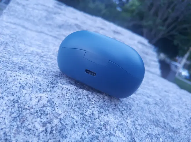 采用了精英蓝配色,让人的感觉非常舒适,还提供有奇迹白、风度黑、樱花粉、丛林绿等款式可选,满足不同人的喜好。充电仓顶部有sanag标识,外形像一个椭圆形的卡通蛋,表面采用了磨砂工艺处理,手感舒适细腻,不易沾染指纹。