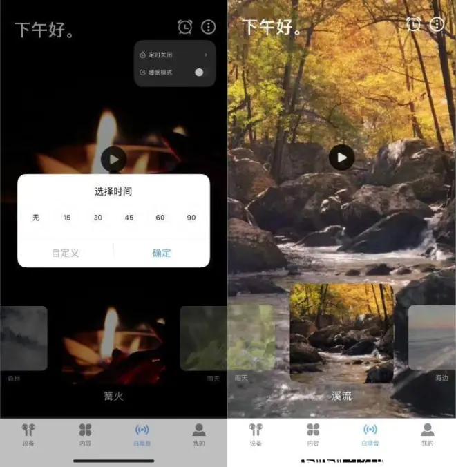 iKF Sun还可以在搭配iKF APP使用,对耳机进行操控,里面还有提供了很多助眠的音乐和音效,像下雨声、溪流声、鸟鸣声或者是助眠效果有一定的白噪音等,都可以按自己的需求,在app上选择。