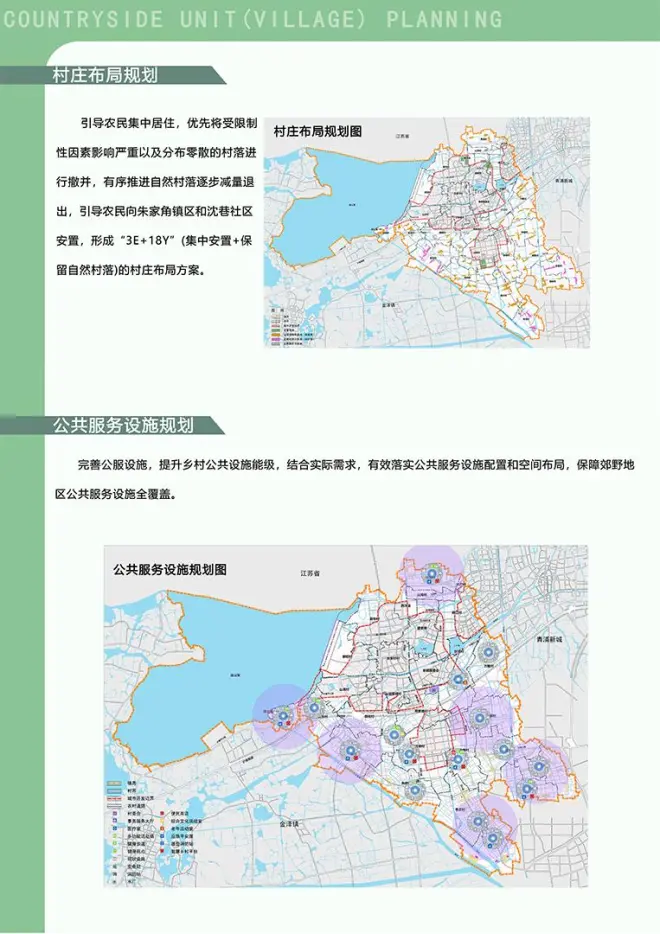 在村庄分布规划章节提到:引导农民集中居住,优先将受限制性因素、影响严重以及分布零散的村落进行撤并,有序推进自然村落逐步减量退出,引导农民向朱家角镇区和沈巷社区安置,形成"3E+18Y”(集中安置+保留自然村落)的村庄布局方案。