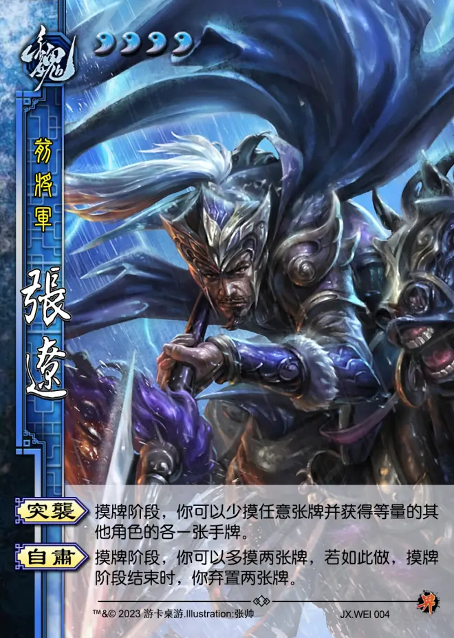 历史思路:文远是一个很能自省自肃的人。历史上,他多次通过自肃和从谏的方式调节了与其他将领的矛盾。这里自肃摸两牌同样也代表着他与李典乐进顾全大局的表现,并能以此配合突袭。(当然后面弃牌是为了做平衡了)