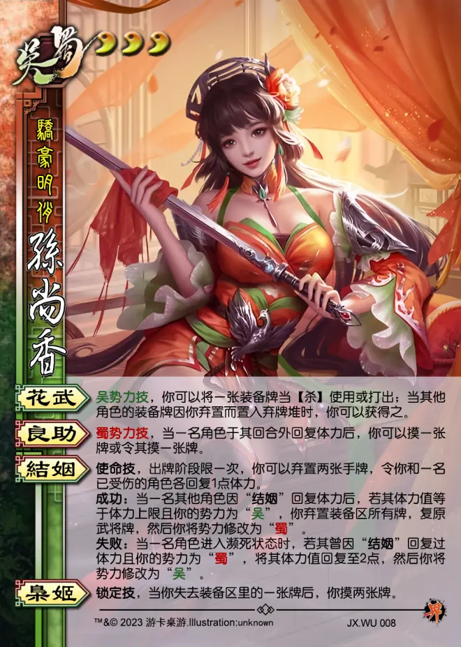 喜欢立绘+把两个孙尚香缝一起的产物。和谋孙尚香类似,但技能不一样。游戏开始时可以选择“蜀”、“吴”势力,然后对应不同的使命技。因为这个孙尚香有两条线(什么gal),所以设计思路要分开说。