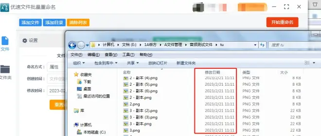步骤4,完成并确认设置后,点击右上角【开始重命名】红色按钮启动软件程序,当软件弹出成功的提示框时,那么文件的修改时间已经按你设置的修改成功。