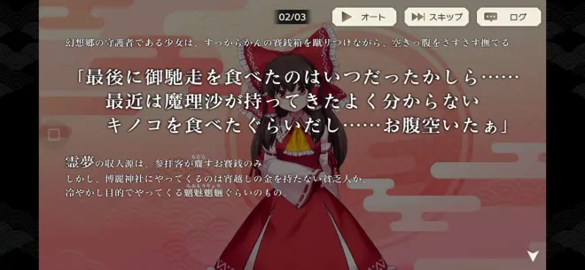 幻想郷の守護者である少女は、すっからかんの賽銭箱を蹴ながら、空きっ腹をさすさす撫でる。