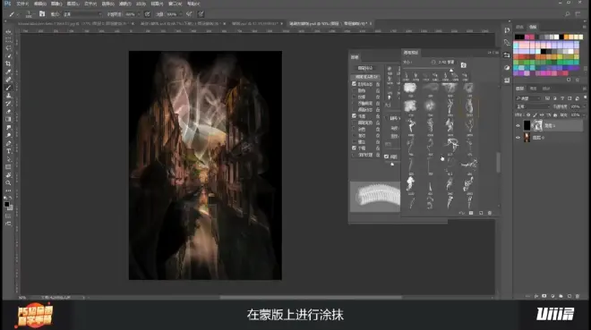 选中图层—添加蒙版—选中画笔工具涂抹画面(这里的画笔工具是黑色)