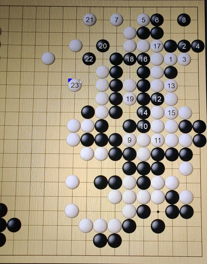 这盘棋下了一个半小时,他下的特别慢,不过这样对我长期不下棋的人来讲好事儿,可以好好思考,我单纯看棋感理想图大概是这样子(心中这盘棋接下来该这样走砍他大龙)但是我滑标了,把1冲走成了3点刺,然后直到末尾双方的棋都没有活! 然后我就想吃掉他,然后就。。。 等我休息好了做个视频吧 这盘棋把昨晚刚刚给段位学生讲的仙鹤大伸腿,聚杀等等都用上了。