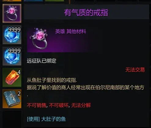 使用大肚子的鱼有极低概率会出有气质的戒指,见下图