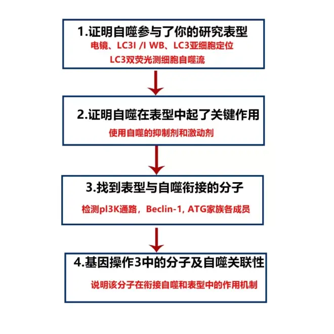 一个清晰的研究思路是做研究的第一步,也是非常关键的一环,明确研究思路之后设计实验方案或是查找参考文献才能事半功倍,自噬研究的常用思路可参考下图。