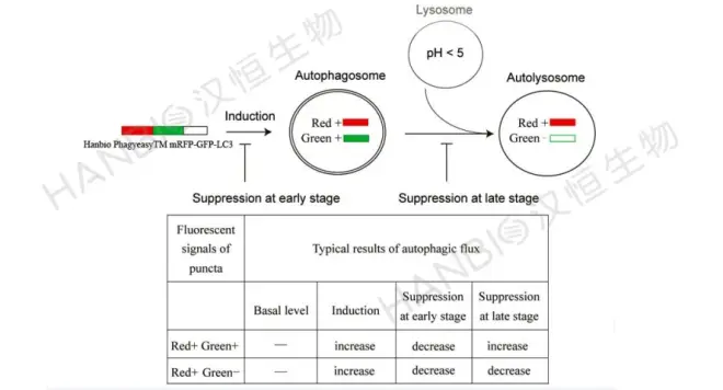 汉恒生物作为国内首个研究自噬的公司,研发了多种自噬研究工具。mRFP-GFP-LC3是研究细胞自噬最常用的工具之一,在mRFP-GFP-LC3的基础上汉恒生物研发出了AAV-LC3工具,可实现在体自噬监测。后续还研发出了可定位细胞器的自噬研究工具,其原理是用细胞器-RFP(红光)和LC3-GFP(绿光)分别标记细胞器和自噬小体,实现两者的共定位,例如线粒体定位的RFP(mito-RFP)、高尔基体定位的RFP(Golgi-RFP)、溶酶体定位的RFP(Lyso-RFP)等,具体可见表1。关于如何根据研究需求选择并应用这些工具,将会在之后的干货分享中详细介绍,感兴趣的小伙伴可以留意一下哦。