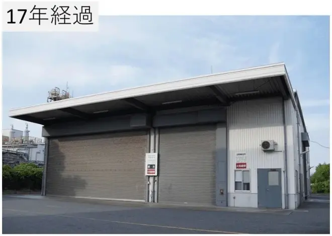 这次要介绍的业绩是罗巴鲁公司的交野工厂,钢结构上大量使用了罗巴鲁涂料替代热镀锌防腐。罗巴鲁交野工厂于2006年3月竣工,自建成以来,已经过了17多年了。我们来一起工厂竣工时和现在的样子变化吧!工厂正面的照片17年后,立体仓库运转中心的热镀锌的卷帘门可以看到有点生锈了。