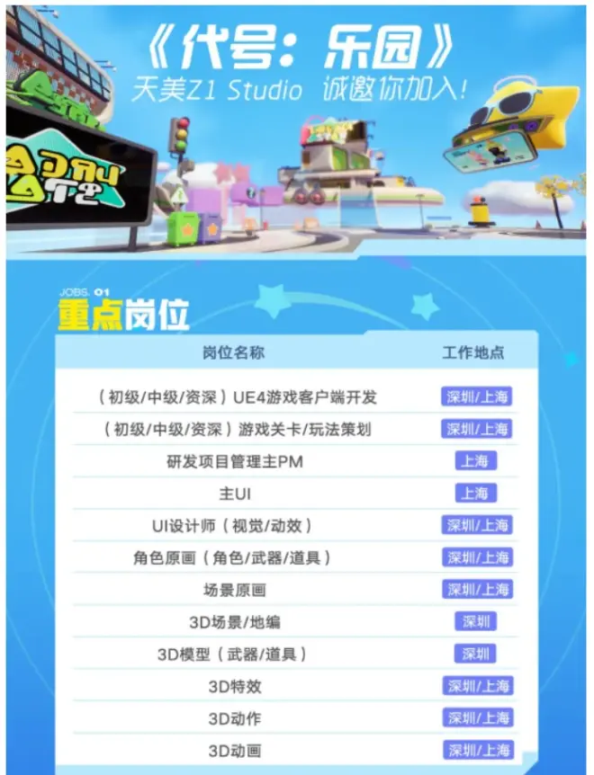目前腾讯天美工作室(TiMi Club天美俱乐部)、腾娱互动(腾讯子公司)的公众号都发布了《代号:乐园》的招聘需求,岗位包括策划、原画、PM等,工作地点位于深圳或上海。