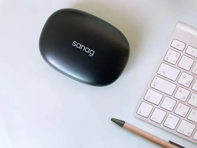 耳机本身呈两个圆球形状,外观可爱精致。大的圆球上印有sanag塞那的标志,展现出品牌独特的风格。无论是外出还是旅行,这款耳机都非常方便携带。