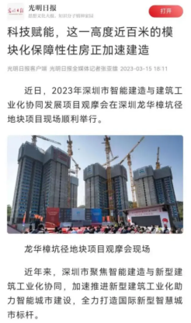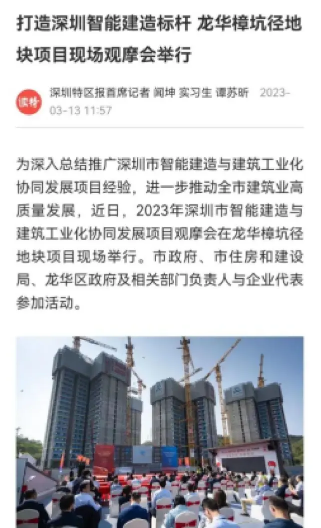 近日,2023年深圳市智能建造与建筑工业化协同发展项目观摩会在深圳龙华樟坑径保障房EPC项目举行项目现场顺利举行。光明日报、中央广播电视总台国际在线、南方日报、深圳特区报、深圳商报等多家主流媒体进行报道。