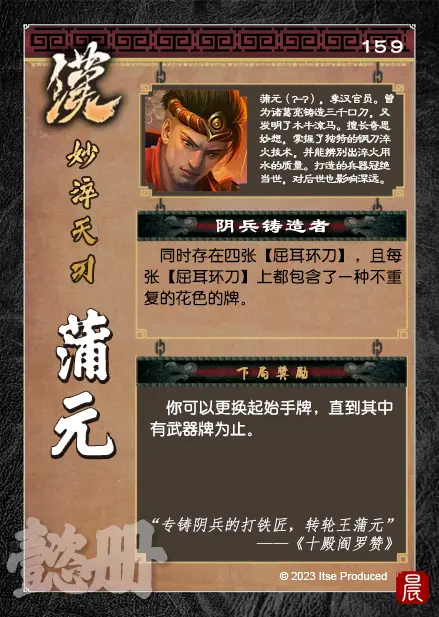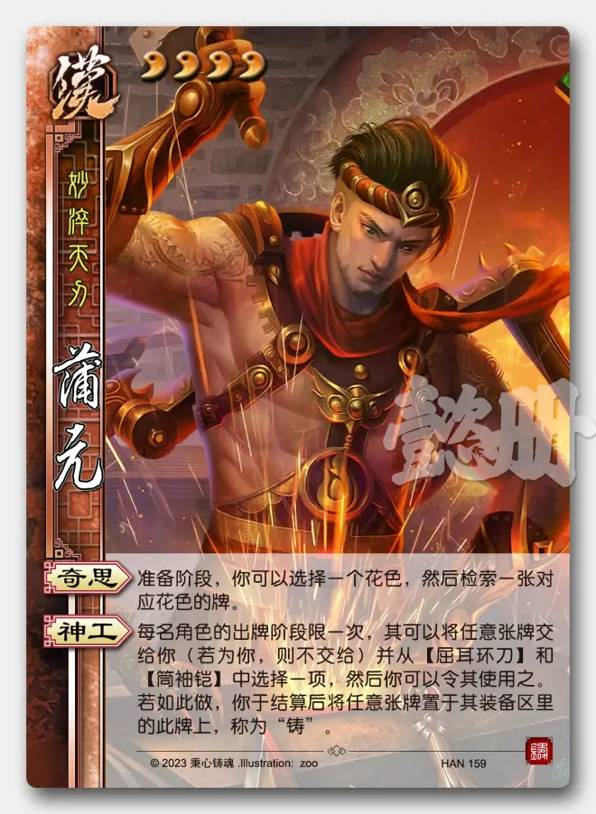 ☆拒绝魔幻路线!屈耳环刀(《蒲元别传》里直接提及)和筒袖铠帽(据《中国通史》)是蒲元确实打造过的兵器和铠甲。蒲元也是我改了无数个版本的将,最终敲定了以这种形式来实现委托造刀的画面和武器牌的加成。同时我也有意保持了四个花色效果的不对称,毕竟红桃就是比梅花珍贵很多。