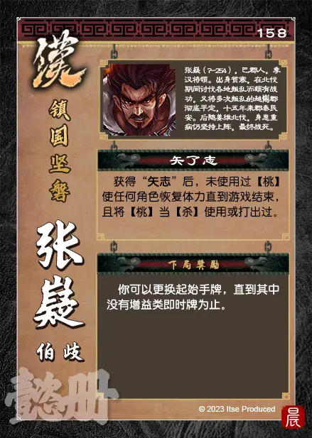 ☆蜀汉说客的最后一位!各版的元素都结合了一点。给牌代表“赐座”或者单纯的赏赐(官方〖承赏〗事迹),以示对宗预的认可;弃牌就是一直硬刚了。“主动的给牌”和“被动的弃牌”之间有一种微妙的平衡,让对手进行这样的抉择无疑是一件很纠结的事。