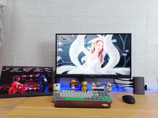 最实用的场景是双屏,把笔记本合上盖作为主机,大屏作为主显,便携屏作为扩展,这样的足够我们日常工作使用,也不会显得桌面凌乱复杂。