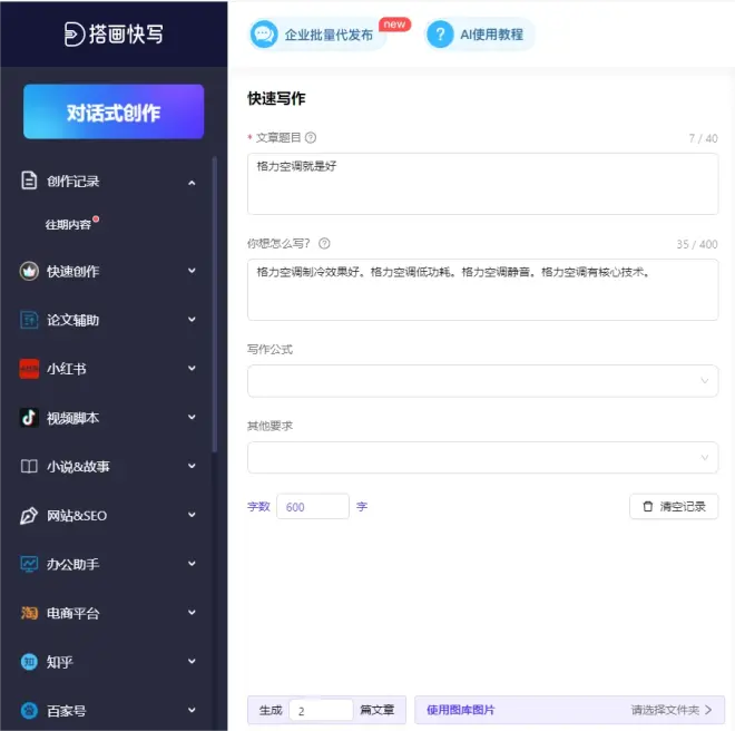全智能的【搭画快写】-自动绘画描述文案的自动写作,搭画快写是拥有自主模型的写作平台,并且对外开放API,支持批量写作,支持营销内容发布。