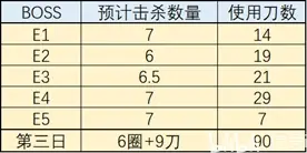由于这期做不到7圈整的排刀,导致排刀每天都有变化,因此这里用我们第三日的排做个例子。我们第三天从三王剩余4500W起手,预计打6+9,得出下表。
